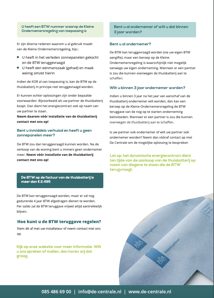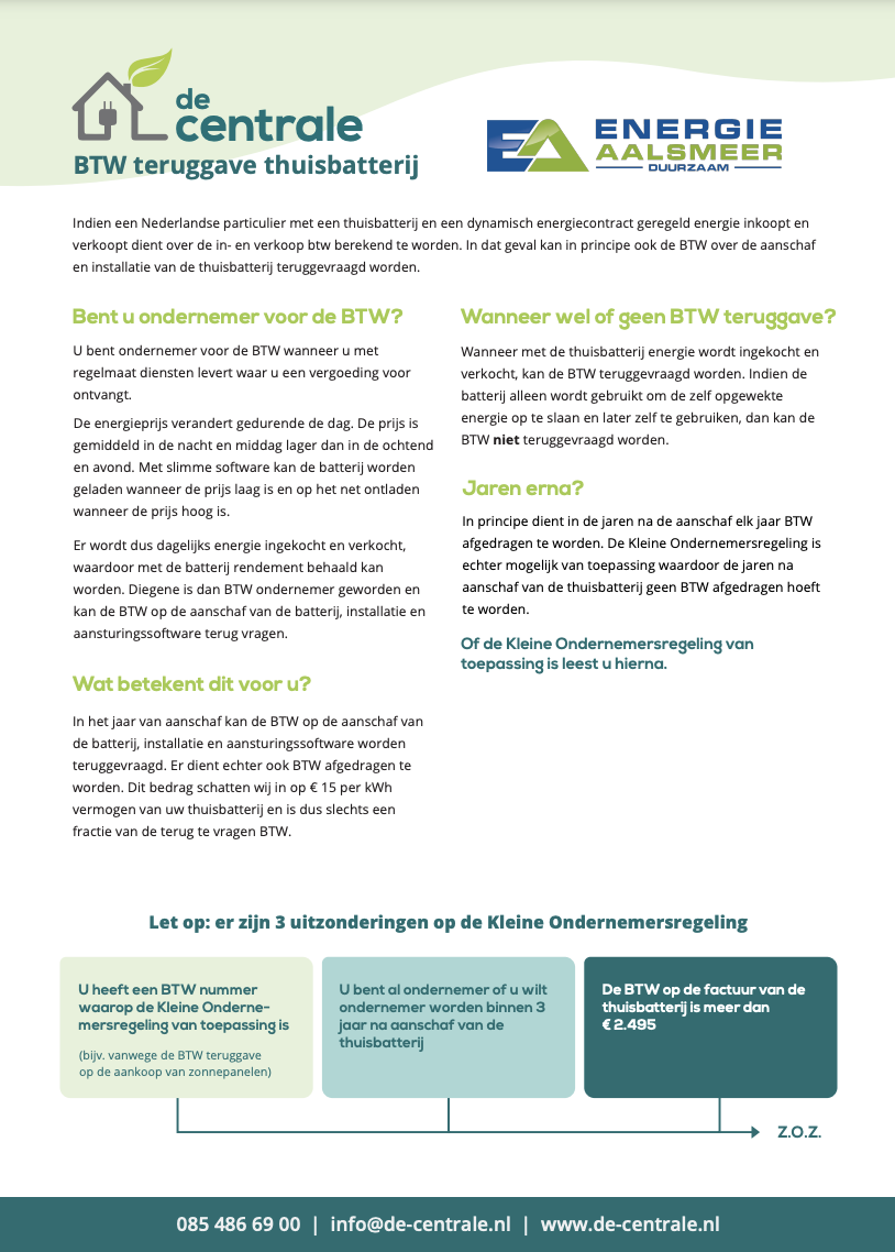 Indien je als Nederlandse particulier met een thuisbatterij en een dynamisch energiecontract geregeld energie inkoopt en verkoopt dient over de in- en verkoop btw berekend te worden. In dat geval kan in principe ook de BTW over de aanschaf en installatie van de thuisbatterij teruggevraagd worden.